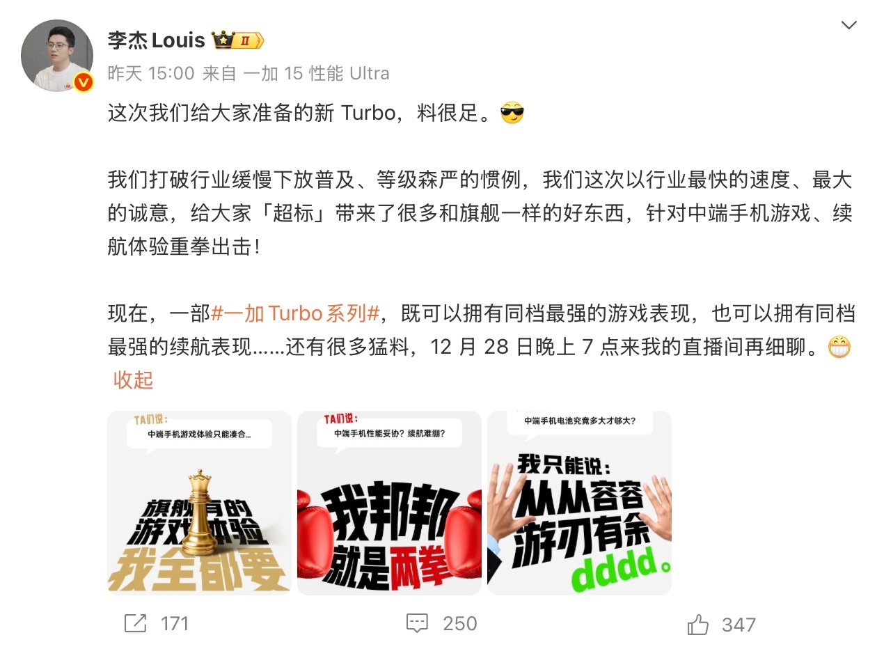 12月26日消息,一加中国区总裁李杰表示,一加全新的Turbo系列即将亮相,外观设计上用三个字来形容,就是:小清新。在一众电竞风格设计的手机中,李杰表示一加Turbo系列就是一股清流,猜测新品的外观也将延续简约的设计风格。
