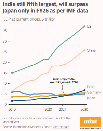印度知名财经媒体MINT则发文指出,尽管苏布拉马尼亚姆用IMF的数据加以佐证,但事实并非如此。根据IMF今年4月发布的《世界经济展望》报告显示,印度2025财年的GDP预计将达到3.909万亿美元,而日本2024日历年的GDP预计为4.026万亿美元。因此,印度目前仍是世界第五大经济体。