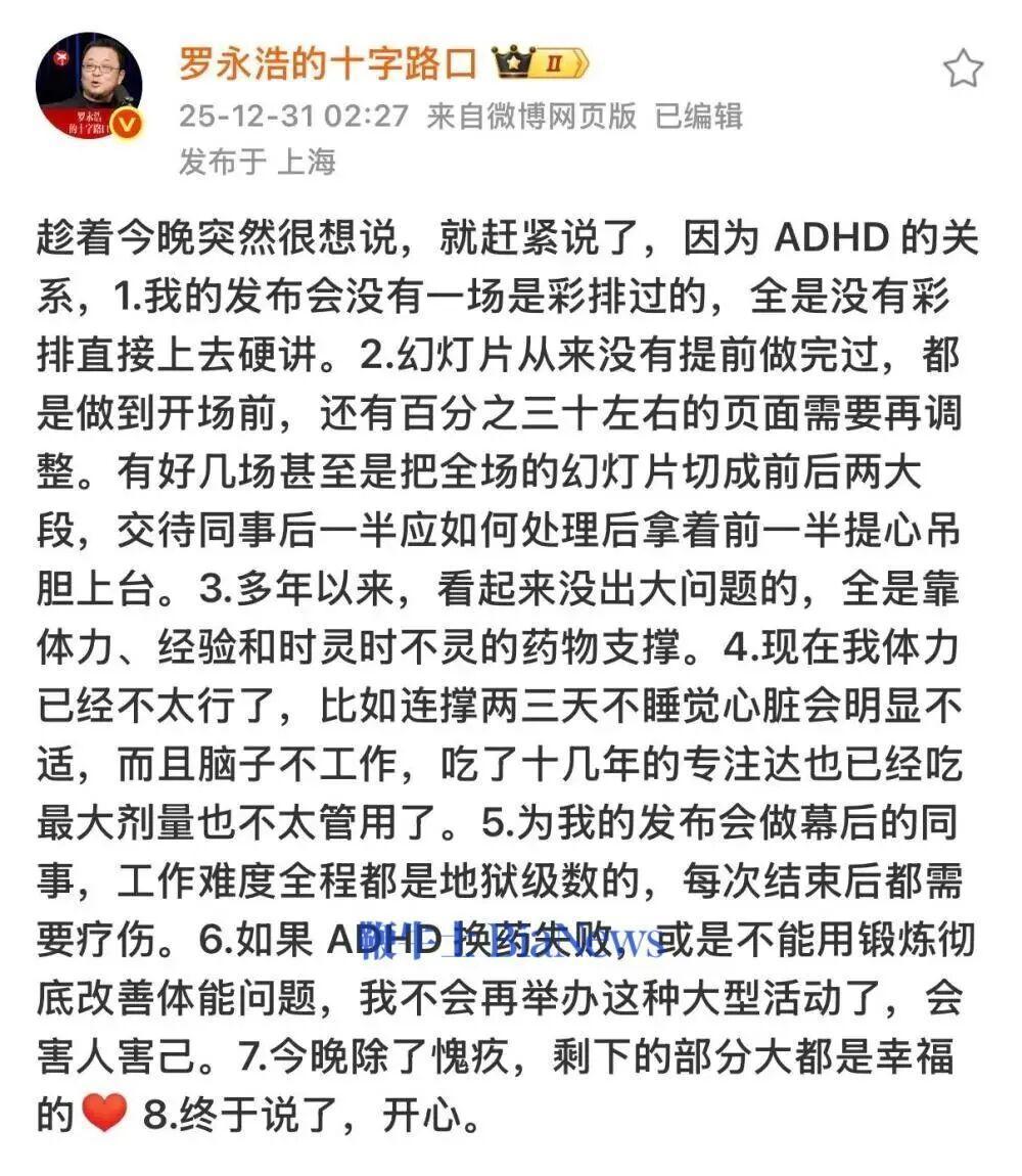 12月31日夜间,罗永浩“科技春晚”结束之际,他发文自曝身患ADHD(注意力缺陷多动障碍)多年,常年靠着药物维持身体。博文中还提及了自己的发布会。