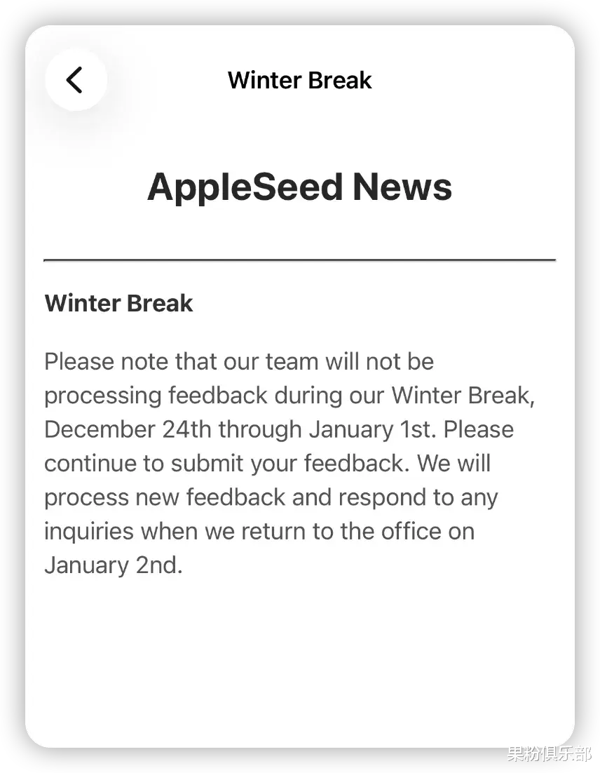 按照苹果的说法,自 12 月 24 日(太平洋时间)起,公司将开始为期一周左右的寒假(Winter Break)。