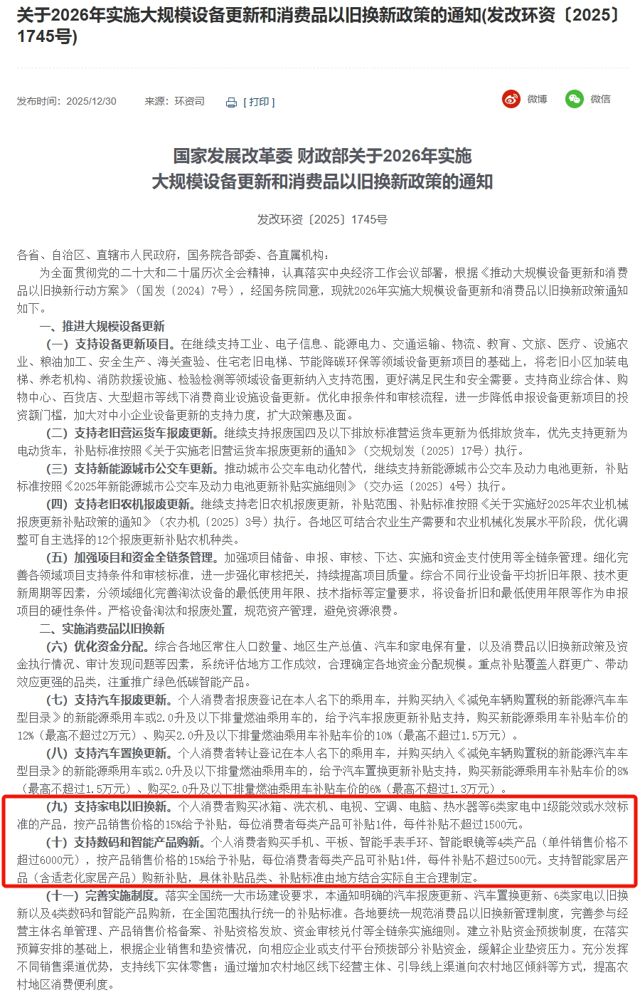 12月30日,2026年的国补信息公布,我们机佬最关心的汽车、家电、数码产品在第七到第十条: