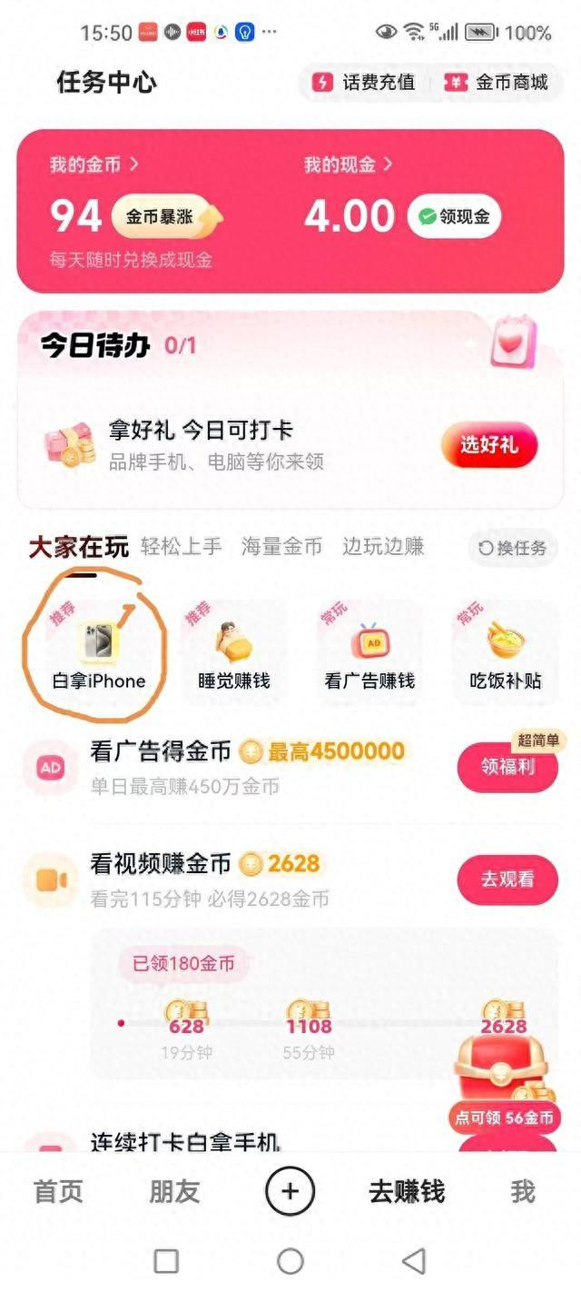 华商报大风新闻记者下载快手极速版和快手App,均有签到挣钱的活动。下载快手极速版之后的几天,记者并未使用过该App,但经常收到账户通知,“点击立即可领取,提现到微信秒入账。”,快手也是打开就会有“连续签到14天得8.2元”等弹窗。活动页面推荐的有白拿iPhone、边看边赚钱、走路赚钱、瓜分百亿等。记者看到,在快手白拿好礼的活动页面,打卡时间最短的活动为白拿20元现金奖励,须打卡30天;最长的为白拿手机,须连续打卡365天,目前的奖励为小米17Pro12GB+256GB颜色随机。