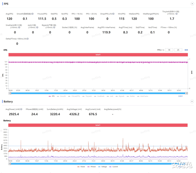 1小时《王者荣耀》测试结束后,荣耀Power2平均帧120帧,1%Low帧111.5帧,平均功耗约2.9W,全程稳成直线,毫无压力。