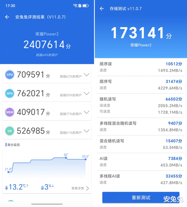 在安兔兔V11版本中,荣耀Power2跑分总成绩为2407614分;存储测试中,荣耀Power2得分173141分,具体各项成绩如下: