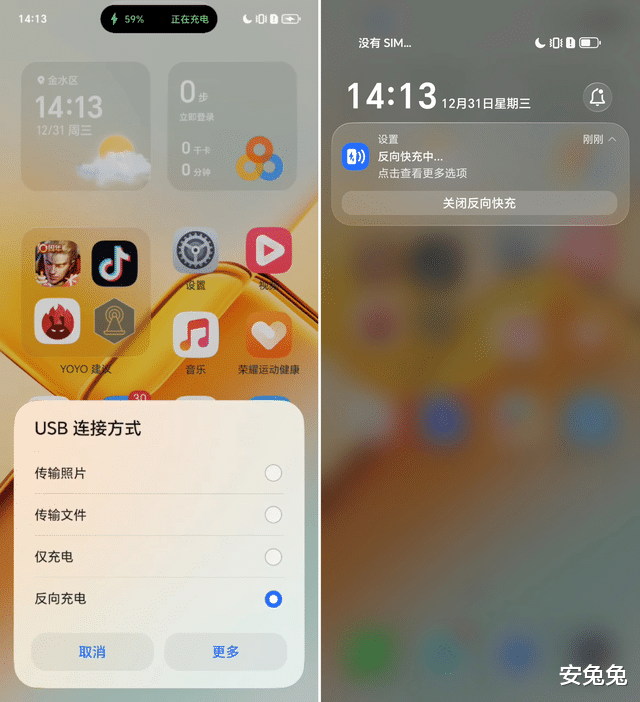 使用一根CtoC数据线连接荣耀Power2与另一部手机,并在USB连接方式中选择“反向充电”即可开始充电,这下淘汰充电宝真不是开玩笑了。