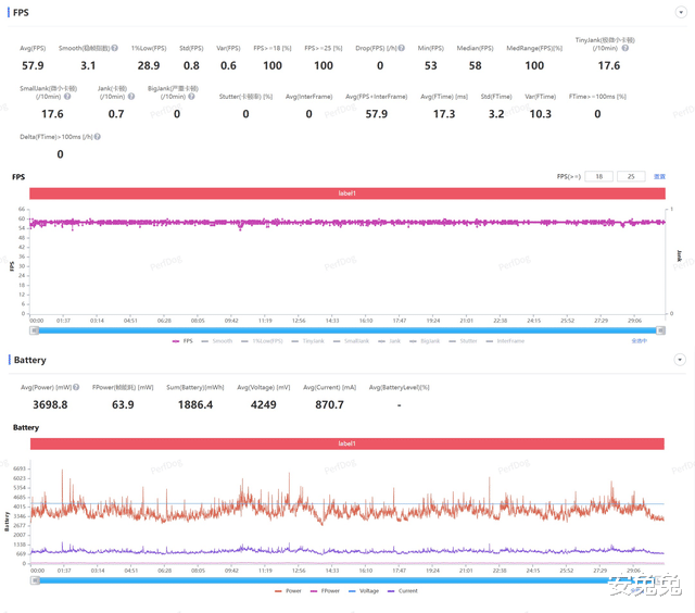30分钟《原神》须弥城跑图测试结束后,荣耀Power2平均帧57.9帧,平均功耗约3.6W,测试全程没有明显波动,体验流畅。