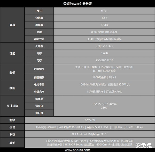 在10080mAh青海湖电池、鸿燕六翼天线系统与天玑8500 Elite的加持下,荣耀Power2在核心的续航、通信和性能方面均看齐旗舰,甚至能超越旗舰,配置可谓是全面越级,不愧是“户外轻旗舰”。