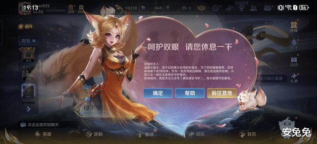 到了8小时游戏弹出护眼休息提示,手机剩余电量仍有56%。