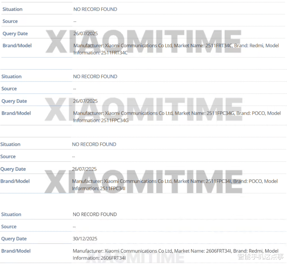 因为科技媒体XiaomiTime通过深挖GSMA IMEI数据库,发现了小米旗下新机型的明确编码,其中2511FRT34C与2606FRT34I等型号赫然在列。