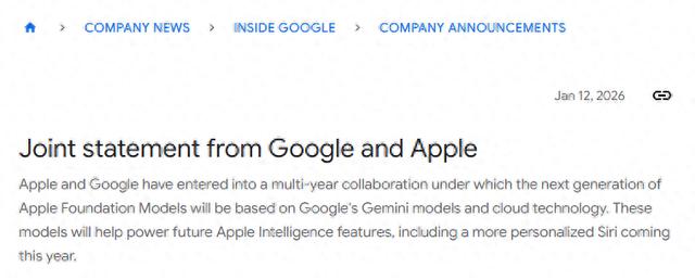 周一(1月12日),两家科技巨头都确认了这一消息。谷歌在官方博客写道,“苹果已与谷歌达成一项多年合作协议,根据该协议,下一代苹果基础模型(AppleFoundationModels)将基于谷歌的Gemini模型和云技术。”