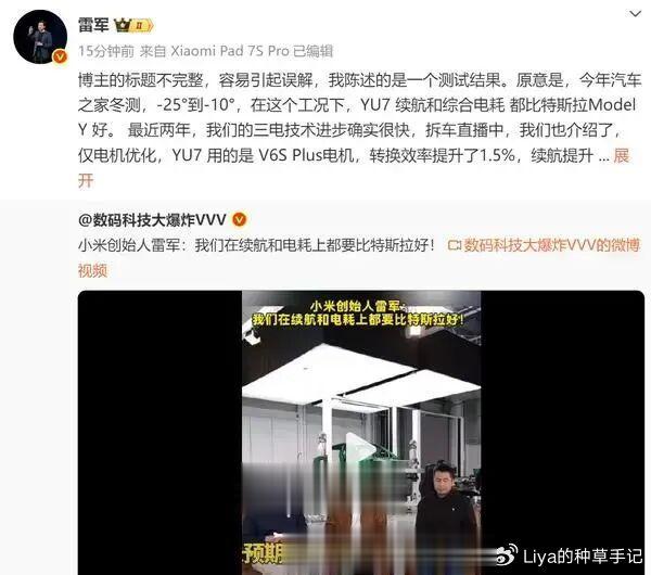 1月5日,雷军又主动转发某科技博主的视频,纠正其不完整的标题,明确说明自己关于续航的表述是特定冬测工况下的测试结果,避免公众误解。