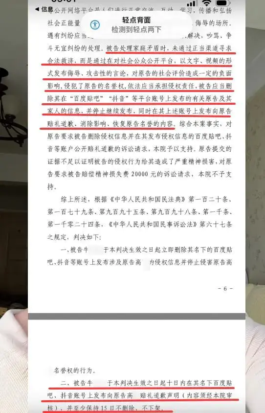 牛某某晒出的判决书载明,被告牛某某处理家庭矛盾时,未通过正当渠道寻求合法救济,而是通过在对社会公众公开平台,以文字、视频的形式发布侮辱、攻击性的言论,对原告高某的社会评价造成一定的负面影响,侵犯了原告的名誉权,依法应当承担侵权责任,被告应当删除其在一些平台账号上发布的有关原告及其家人的信息,并停止继续发布,同时在其上述账号上发布向原告赔礼道歉、消除影响、恢复原告名誉的内容。