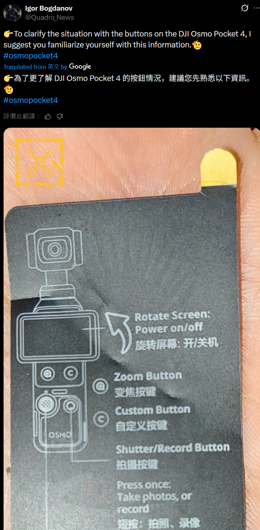 结合IT之家昨天援引IgorBogdanovji爆料,大疆OsmoPocket4标准版手持云台相机现已曝光,外观与前代产品Pocket3几乎没有明显变化,整体仍延续大疆的经典造型,上方配备一枚单摄,下方则是一个可旋转屏幕,屏幕下方的转轴则配有多枚实体按键,其中一枚是变焦按键,另一枚则是自定义C键。