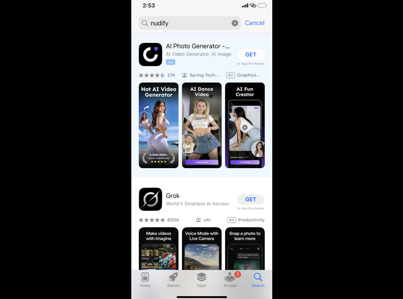 具体来说,研究人员在商店中直接搜索“脱衣”关键词,结果便发现了大量带有性暗示的应用,这些应用的核心功能明显以生成性露骨图像为目的,而并非普通的图片编辑或美化工具。