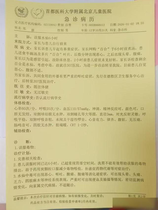 食用后不久,老人和孩子先后出现剧烈呕吐、腹痛头晕等严重中毒症状。送医后,医生诊断表明,误食时间已过长,毒素被身体吸收,情况危急。据了解,经过北京两家医院数小时的紧急治疗,祖孙二人才于次日凌晨返家休养。