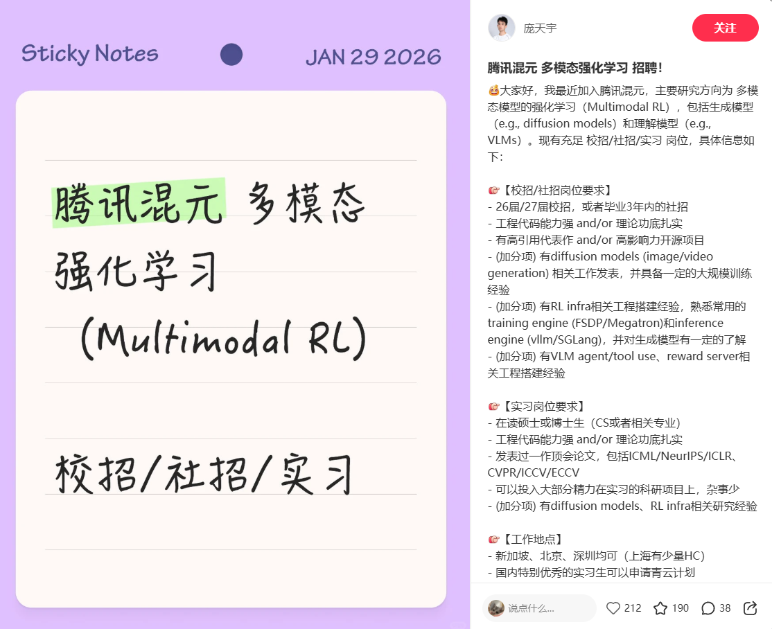 IT之家1月30日消息,清华大学计算机系博士、前新加坡SeaAILab高级研究科学家庞天宇宣布将于2月4日加入腾讯,担任腾讯混元大模型团队首席研究科学家及多模态强化学习技术负责人。