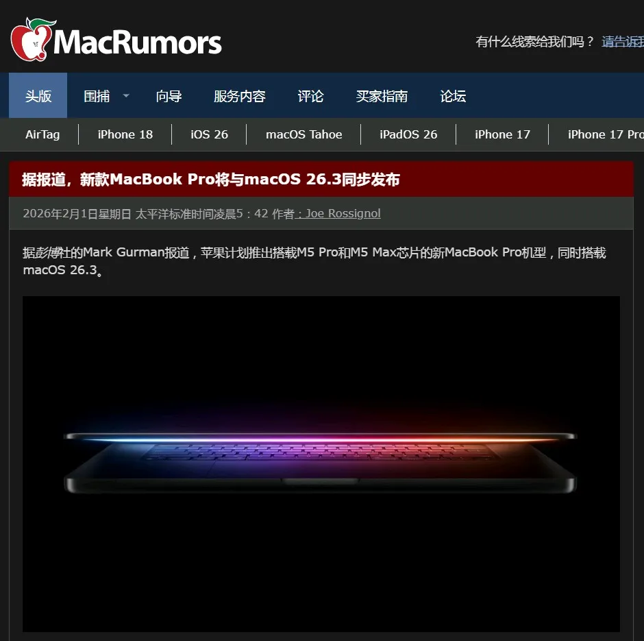 据报道,苹果将为M5 Pro和M5 Max MacBook Pro搭载macOS 26.3,因此新品预计会与系统同步更新。