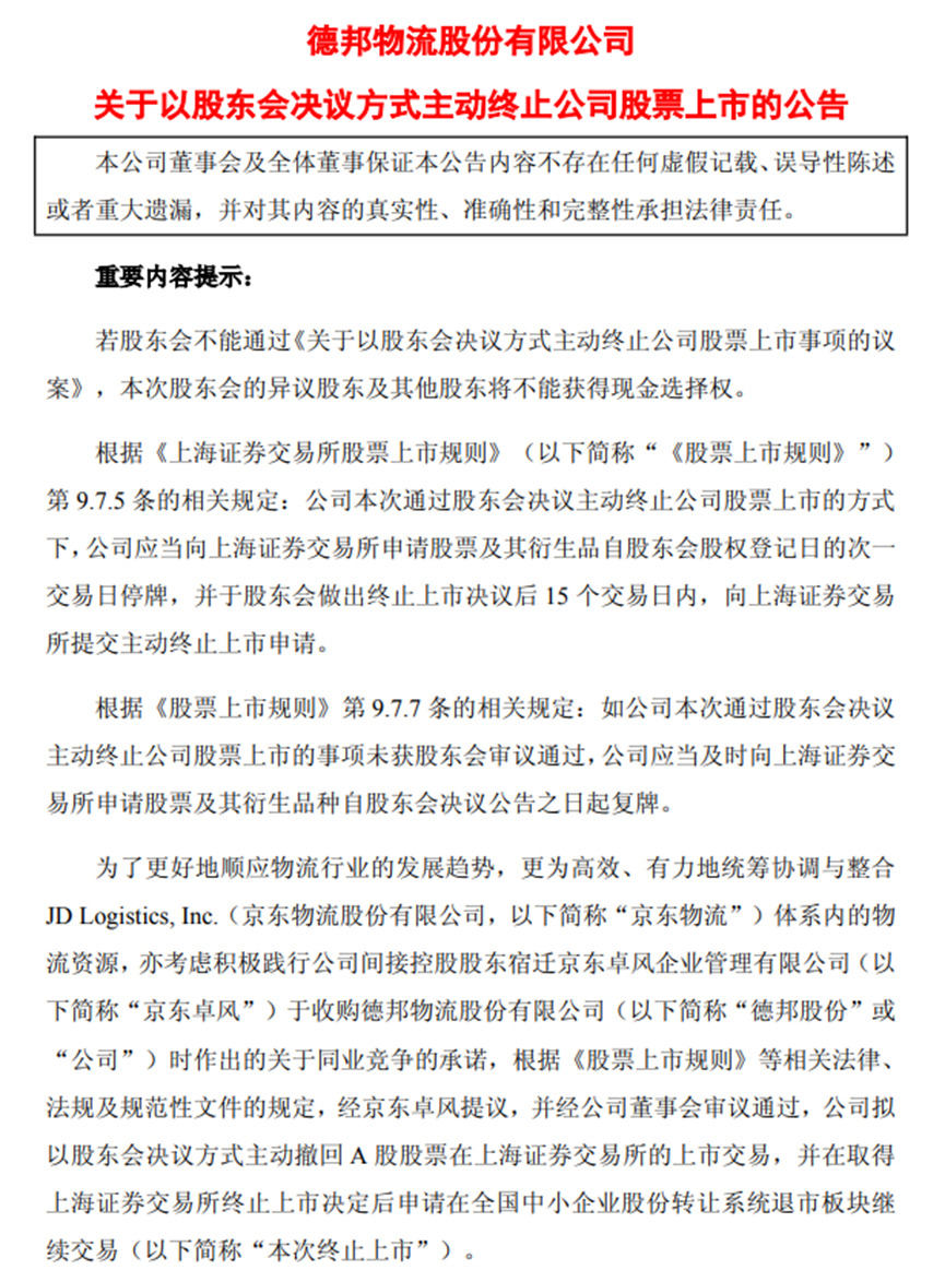 就在不久前,德邦宣布主动从A股退市,并已向上海证券交易所提交主动终止上市的申请。与此同时,京东物流豪掷近38亿元,以19元/股的价格,收购了德邦剩余的全部股份。