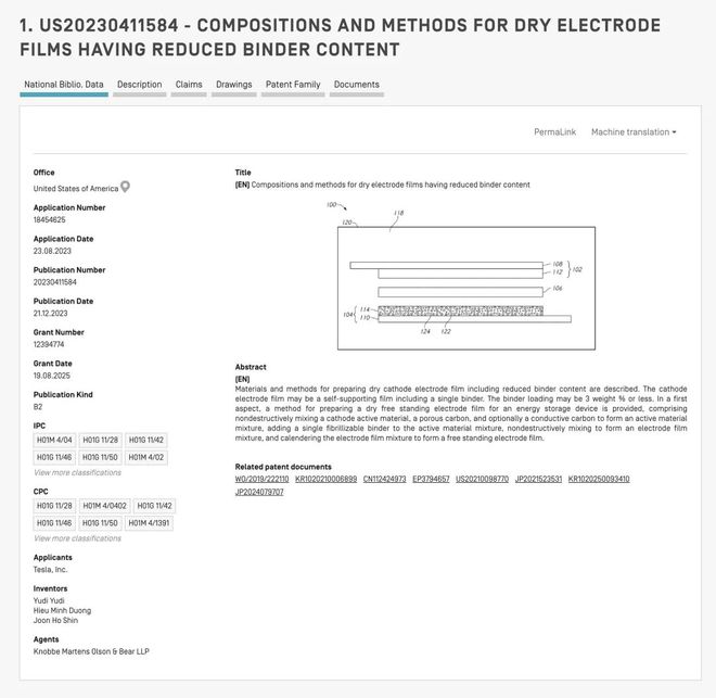 据电动知家了解特斯拉在多款车型上搭载干电极电池,包括Cybertruck与Semi、obotaxi与ModelY、Roadster跑车以及储能Megapack。这项专利将为特斯拉业务以带来非常积极作用并为电池行业带来重大而深远的影响。对特斯拉来说不但解决了4680电池的“续航与成本”权衡,Gigafactory扩建项目中工厂占地面积也将大幅缩减。采用这种温和工艺制造的电池在2000次充电周期后仍保留近90%的容量,这直接支持特斯拉百万英里电池的雄心。由于该技术制造的电池无需高度加工且昂贵的定制粉末,这将使特斯拉摆脱了专业供应链的束缚。
