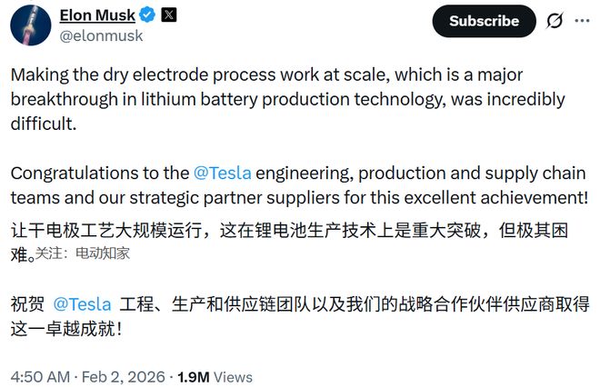 电动知家消息,北京时间今日凌晨,马斯克在X平台表示,特斯拉已成功实现干电极电池工艺的规模化生产,并称这是“锂电池生产技术上的一项重大突破,极其困难”。