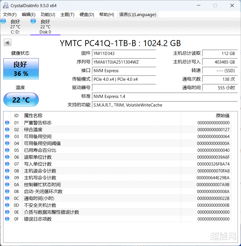 想知道写入量是否真对SSD寿命造成实际影响,可以看SMART信息里面的“可用备用空间”和“介质与数据完整性错误计数”这两项,前者就是SSD预留的OP空间剩余百分比,SMART全部都是16进制的,所以这项目前数值是64,换成算10进制就是100,也就是写入接近400TB数据后预留OP空间还是完整的。后者则是用于记录控制器检测到的、无法自我修复的数据完整性错误次数,目前还是0说明SSD还很健康。