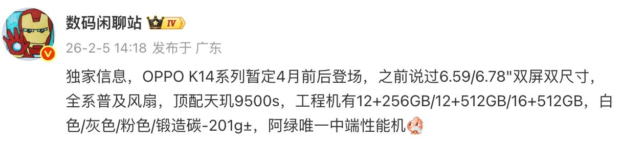 存储方面,OPPOK14系列或提供12+256GB、12+512GB、16+512GB选项,无缘1TB版本。