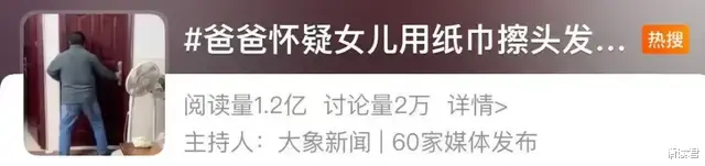 最近,“爸爸怀疑女儿用纸巾擦头发暴力打砸”的热搜引发1.2亿次围观。