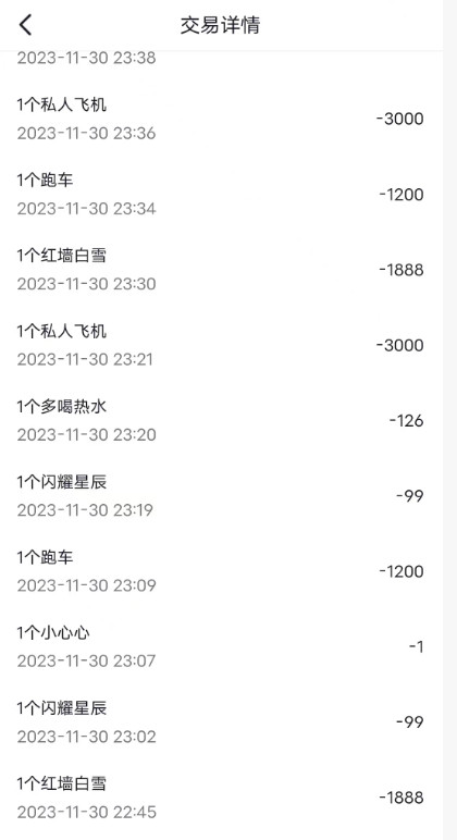 打赏记录显示,方先生2023年10月24日首次给该女主播打赏30元,11月23日至27日累计打赏约1000元,单笔1元至50元不等。