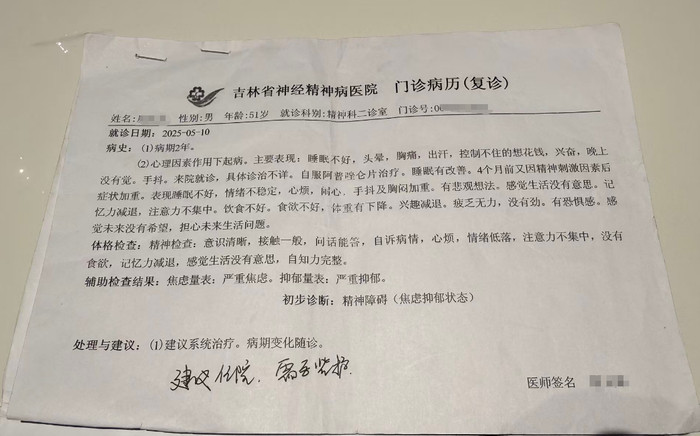 2025年5月,经吉林省神经精神病医院诊断,方先生处于严重抑郁和焦虑状态,住院治疗近一个月。