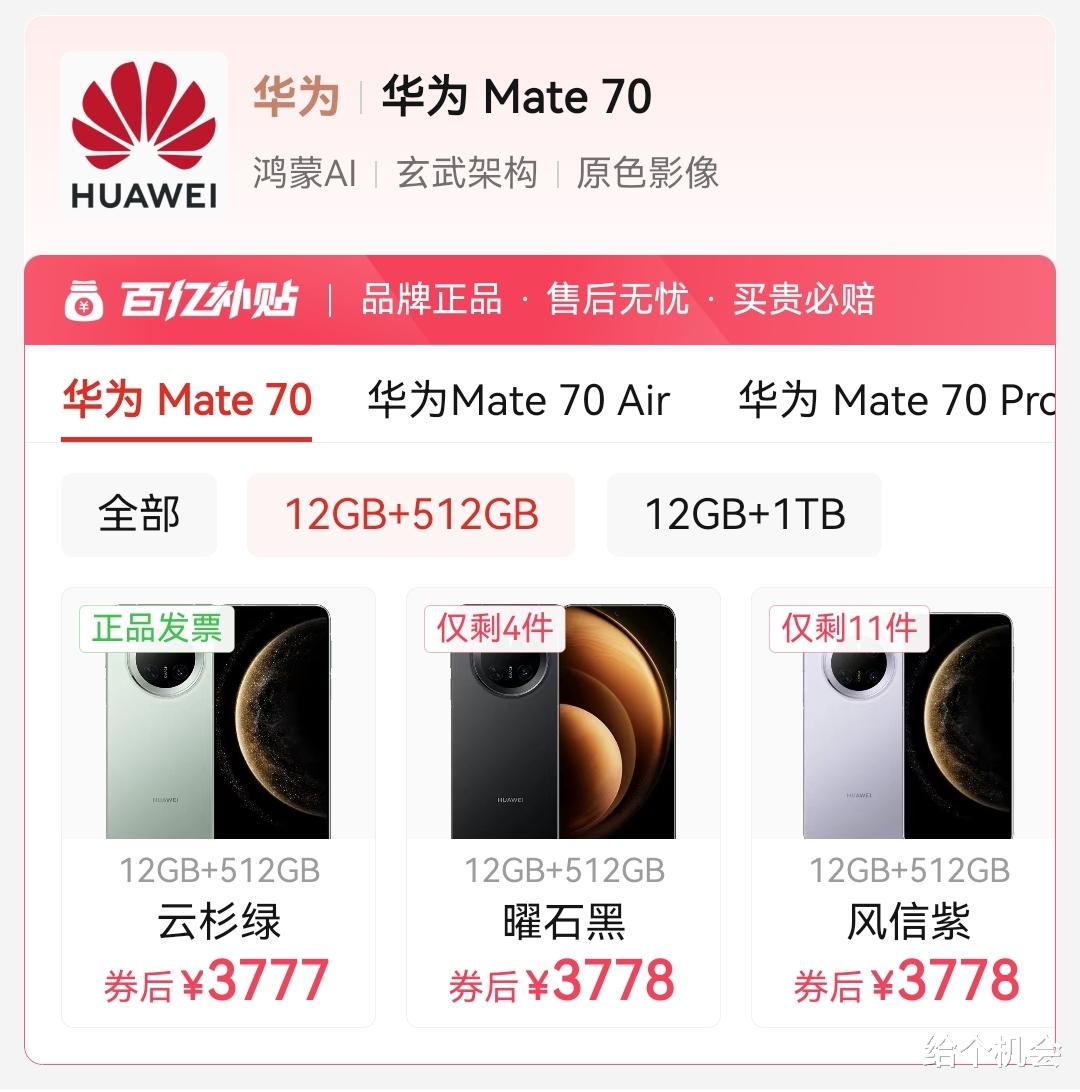 对于一些老款机型,华为官方也给到了很大幅度的降价,例如上代华为mate 70系列就开始清仓了,华为mate 70标准版就很实惠,当初12GB+512GB版本要5999元,现在在平台中跌至3777元,降价一千多元,虽说新款mate 80系列首发就降价八百元,可老款有大幅降价此时入手还是很划算的,问题在于你是否能接受老款,可以在提前了解配置后再做决定。