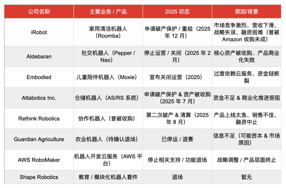 这一年里,多个细分赛道的机器人公司相继倒闭或退出市场:既包括消费机器人领域的老牌公司iRobot,也包括陪伴机器人、协作机器人、仓储机器人等方向的创业企业。一些公司选择申请破产保护,一些被迫清算资产,还有一些则在融资中断后悄然停运。