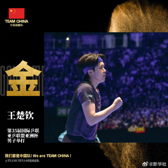TEAMCHINA中国国家队祝贺:挥拍破千浪,热血淬锋芒!昂首,立脊,胆赤,向前!祝贺王楚钦获得冠军!