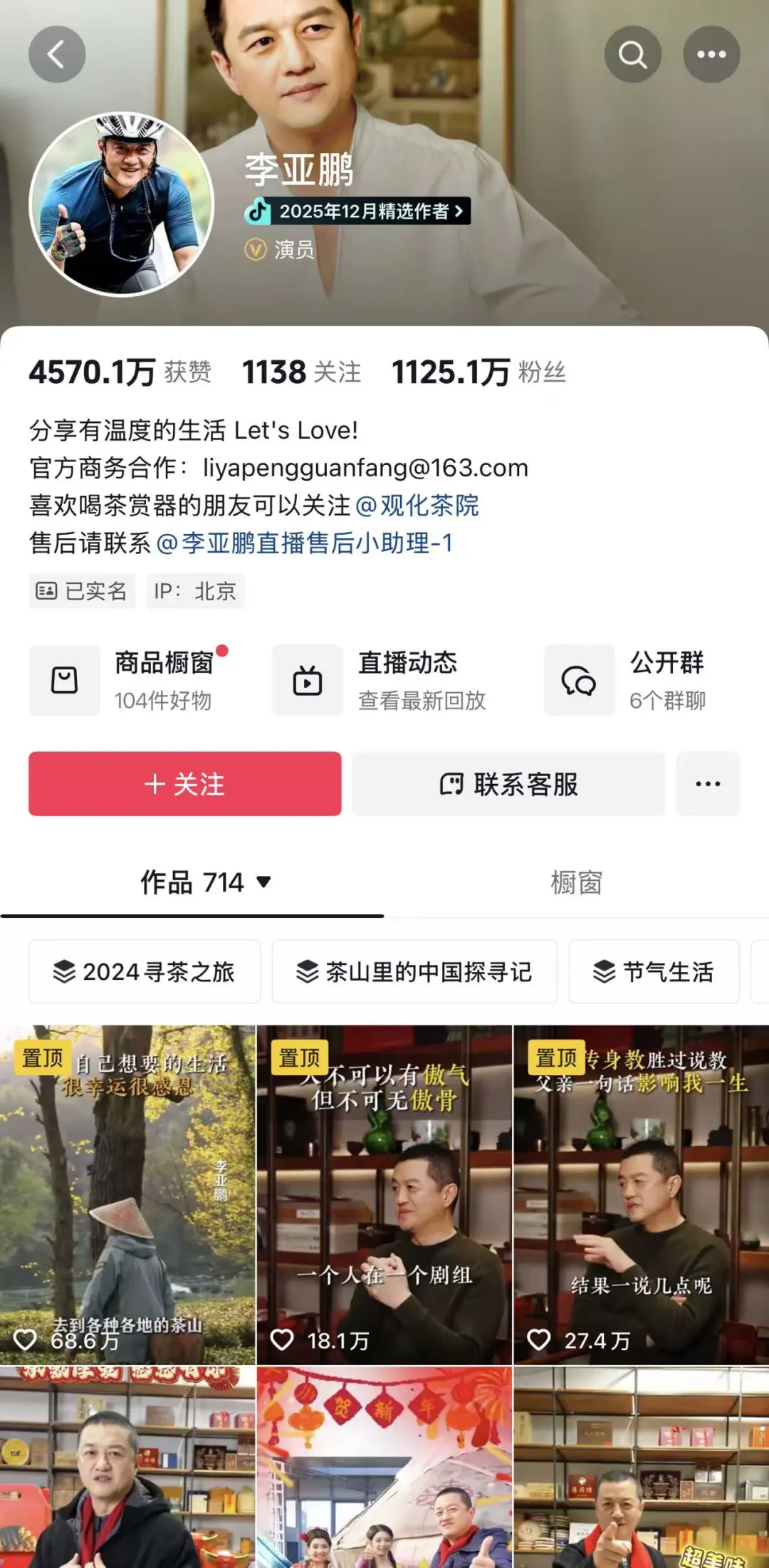 李亚鹏带货持续大火。2月6日和7日,李亚鹏开了两场直播,销售额双双破亿元。第三方平台数据显示,最近30天,李亚鹏共直播13场,场均销售额5000万至7500万元,最近10天内3场销售破亿元。其中,1月30日,李亚鹏开播10分钟就涌入超40万观众,单场增粉超30万;最终销售额超1.8亿元,登顶平台带货总榜,并以普洱茶专场创下行业纪录,居抖音年货榜榜首。