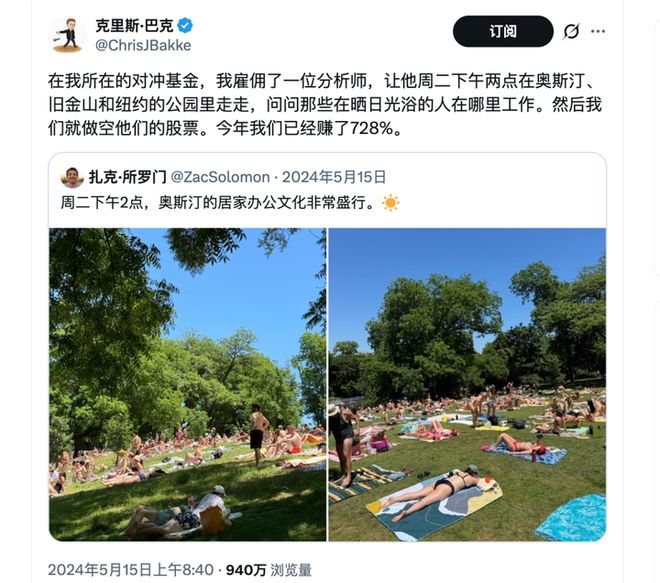 美国科技圈知名博主ChrisBakke,是一名成功的连续创业者。2024年5月发了一条推文:“在我的对冲基金,我付钱给一名分析师,让他周二下午2点,在奥斯汀、旧金山和纽约的公园里转悠,问那些正在晒太阳的人,在哪个公司工作。然后我们就做空那家公司的股票,今年我们已经赚了728%。”