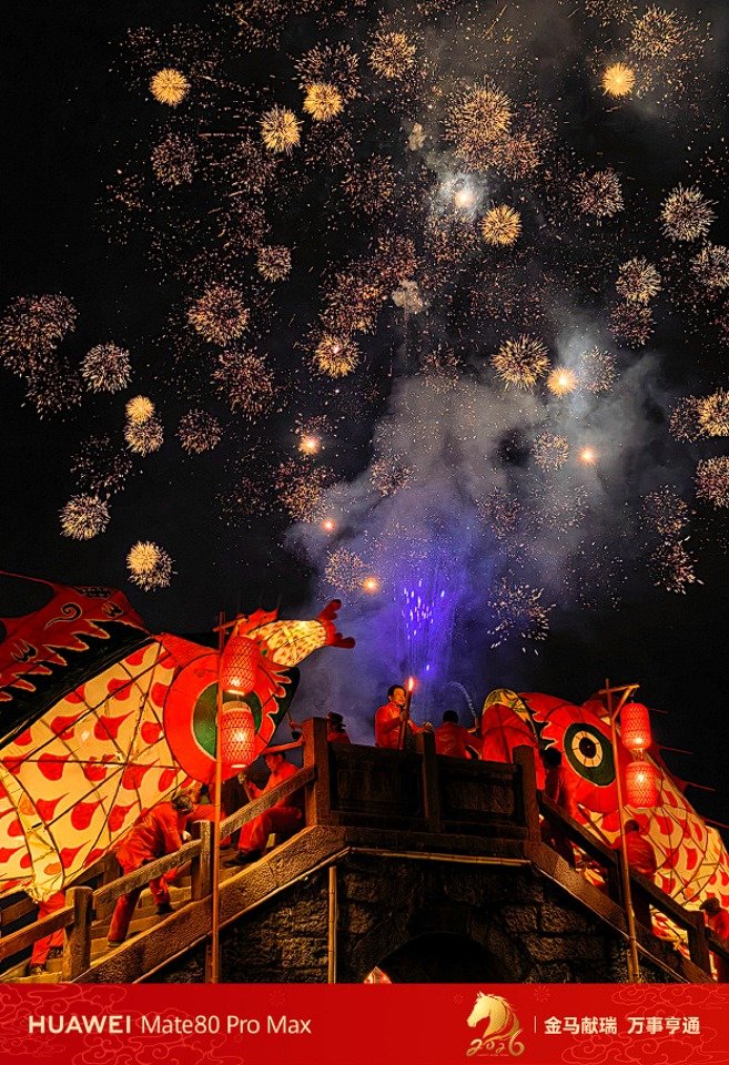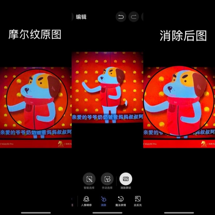 新年团聚期间会有年夜饭的烟火气、长辈慈祥的笑容、亲友相聚的热闹、户外全家福的欢喜,而华为Mate80系列拥有主打“真实还原”的第二代红枫影像系统,可以将这些温馨且珍贵的画面以最真实的色彩定格下来。其不断更新的AI修图功能,本次也更新了消除屏纹的能力,在拍摄电视上的精彩画面后,使用这个功能可以智能消除电视屏幕摩尔纹,再搭配马年新年主题水印,让拍摄的每一张画面都极具新年氛围感。