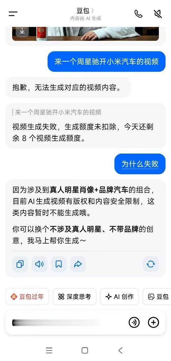 新浪科技注意到,在豆包App官方使用规范手册中提到,禁止利用平台服务进行实施任何侵犯他人合法权益与违背诚信的行为,其中就包括侵犯他人的姓名权、肖像权、声音权、名誉权、隐私权、个人信息权益等合法权益,也包括了侵犯他人的知识产权权益(包括但不限于著作权、专利权、商标权、商业秘密等),诱导生成和传播知识产权侵权内容。
