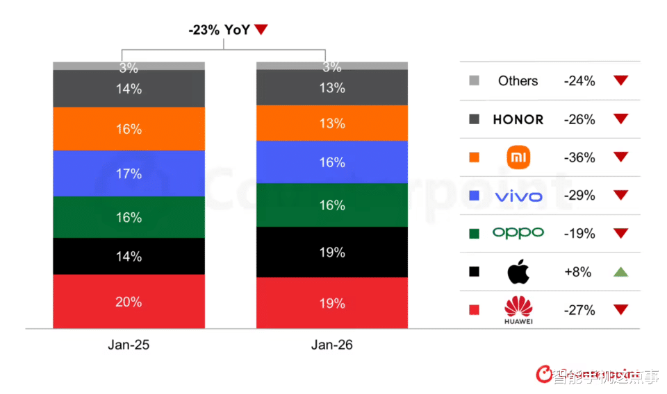 比如近期有媒体称1月中国智能手机大盘同比下滑23%,国产头部清一色两位数血崩,小米跌36%,vivo跌29%,荣耀跌26%,OPPO跌19%,连稳坐第一的华为都跌了27%。