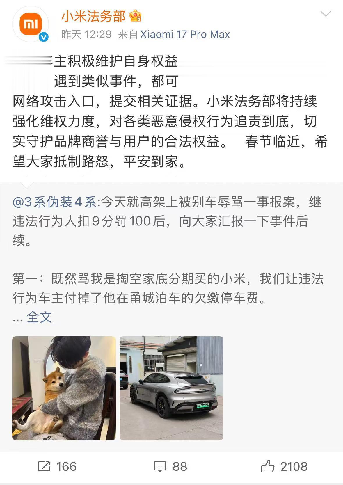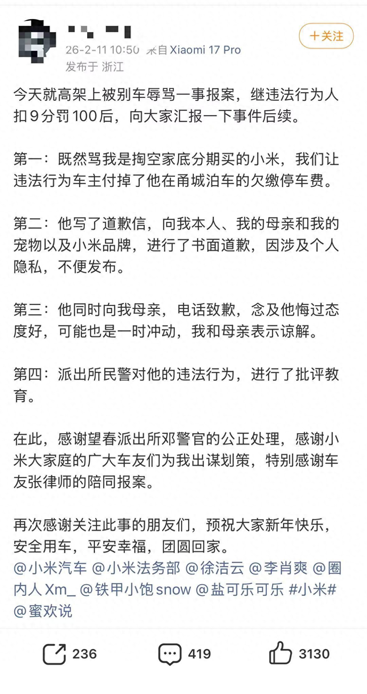 一名小米车主驾车送母亲前往奉化探亲、运送年货时,在高架上规范开启右转向灯准备变道,因右侧有慢车无法及时让行,只能暂时保持原车道,这一正常操作引发了后方黑色特斯拉司机的不满。