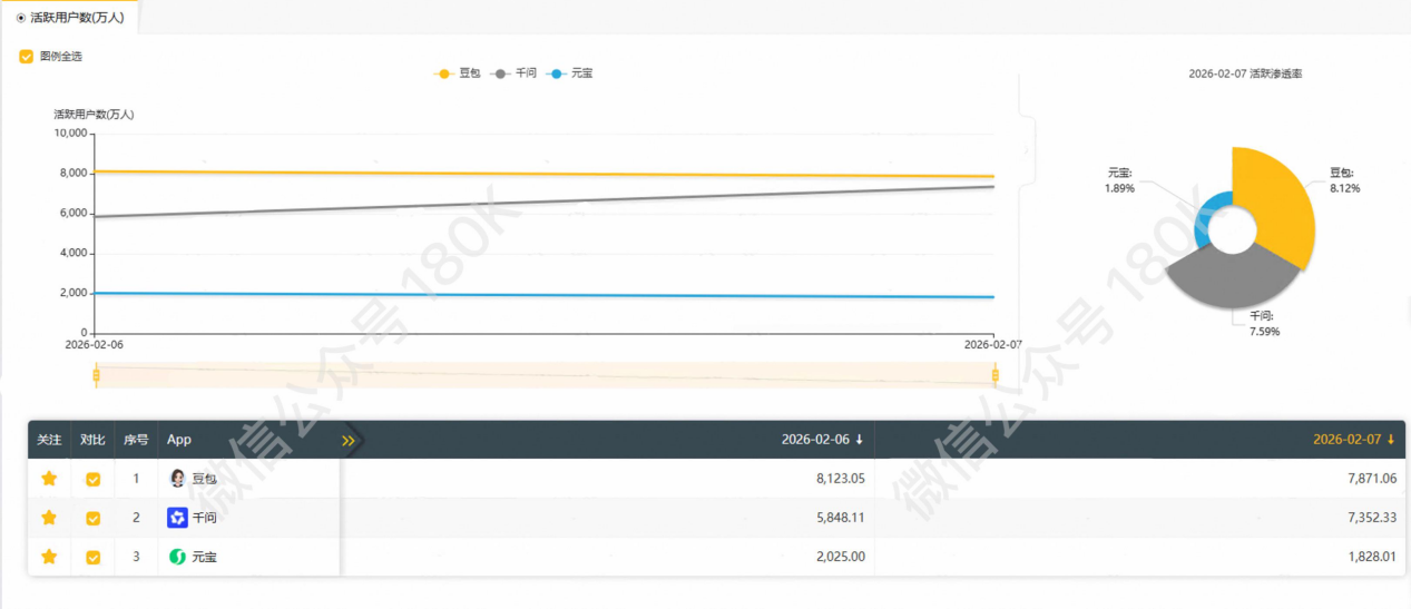 同天(2月7日)豆包的DAU是7871万。豆包首次推出是在2023年6月,千问上线测试是在2025年11月——按照不少媒体的说法,千问只用了短短三个月,DAU就已逼近豆包三年的水平。