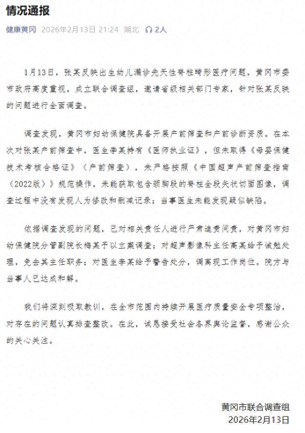 据“健康黄冈”微信公众号消息,1月13日,张某反映出生幼儿漏诊先天性脊柱畸形医疗问题,黄冈市委市政府高度重视,成立联合调查组,邀请省级相关部门专家,针对张某反映的问题进行全面调查。