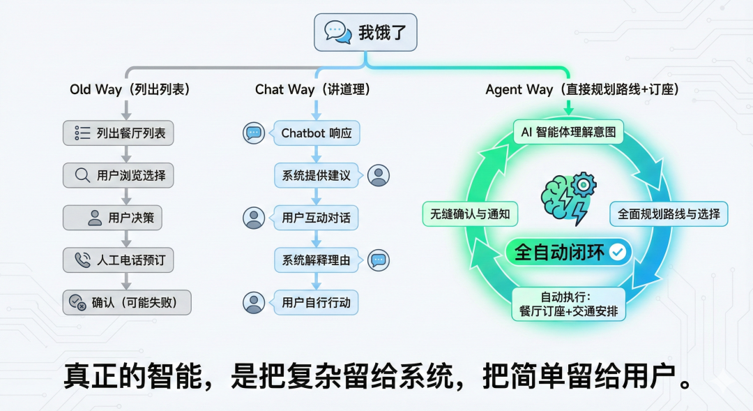 以前,你要完成“订座”这个动作,必须打开“大众点评”这个APP。现在,Agent把“大众点评”拆解成了API接口。