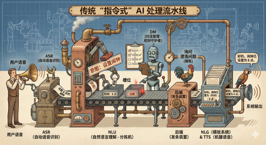 为了理解“传统”,我们需要将目光投向大型语言模型(LLM,如GPT系列)爆发之前的时代(大约2018年以前)。那时的语音助手(如早期的Siri、Alexa、以及银行电话客服机器人)大多属于这一类。