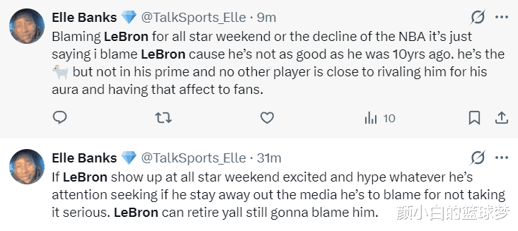 NBA记者Elle Banks写道:如果詹姆斯在全明星表现的兴奋且充满激情(不管是刻意追求流量还是出于真心热爱),那他都算正常发挥。但如果他故意避开媒体,就说明他没有用心对待全明星赛,那么他就要为此承担责任,就算勒布朗退役人们也会指责他。