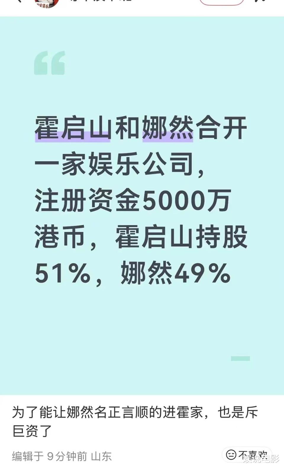 霍启山与娜然确实被曝合开一家娱乐公司,这一商业合作进一步加深了外界对他们关系的猜测。根据多方信息显示,该公司注册资金为5000万港币,霍启山持股51%,娜然持股49%,股权结构显示出双方在合作关系中的主导与协同定位。