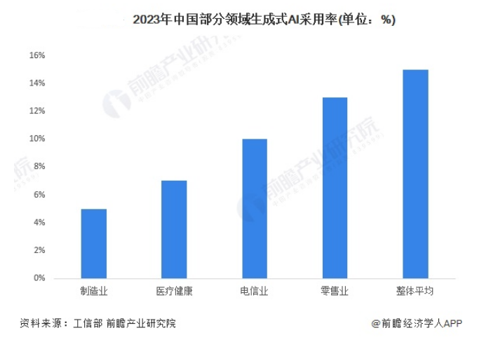 从生成式AI在我国各细分领域的采用率来看,制造业、医疗健康、电信行业和零售业中对生成式AI技术的采用率有较快增长,但也仅分别达到5%、7%、10%和13%,与人工智能企业整体平均的采用率(15%)尚有一定差距。究其原因,可能是当前应用端尚未真正做到易懂易用,AI成为合格生产力前仍需进行过多调校、及其他限制。但可以预见,一旦攻克应用端使用效率问题,生成式AI的市场规模、及其在各行业的使用率会迎来真正的爆发期。