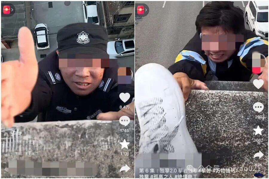这两条“独攀”视频的背景都是技术合成的(网络截屏)