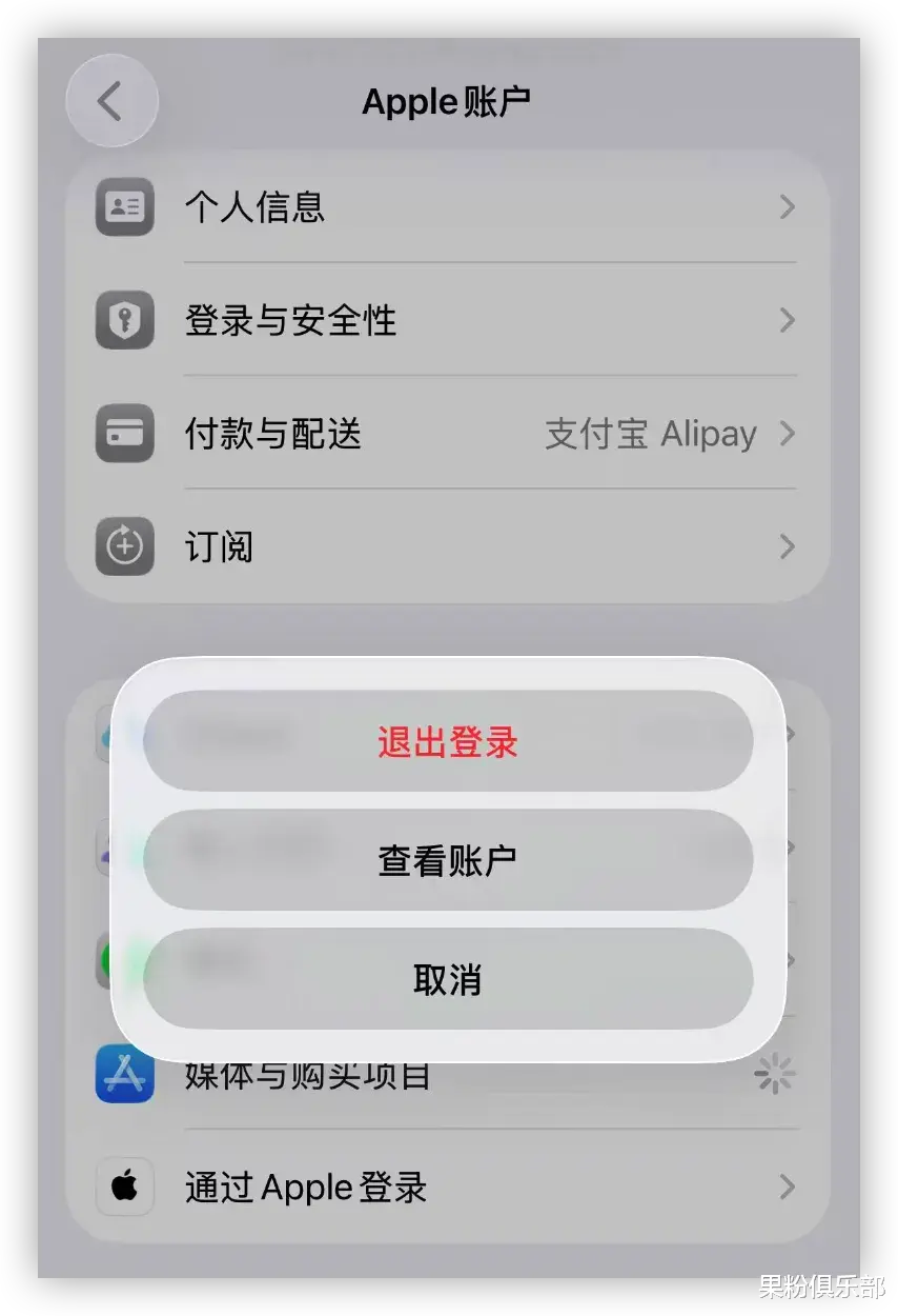 想要退出账号,需要进入「设置」—「Apple 账户」,点击「媒体与购买项目」,才能看到相关选项。