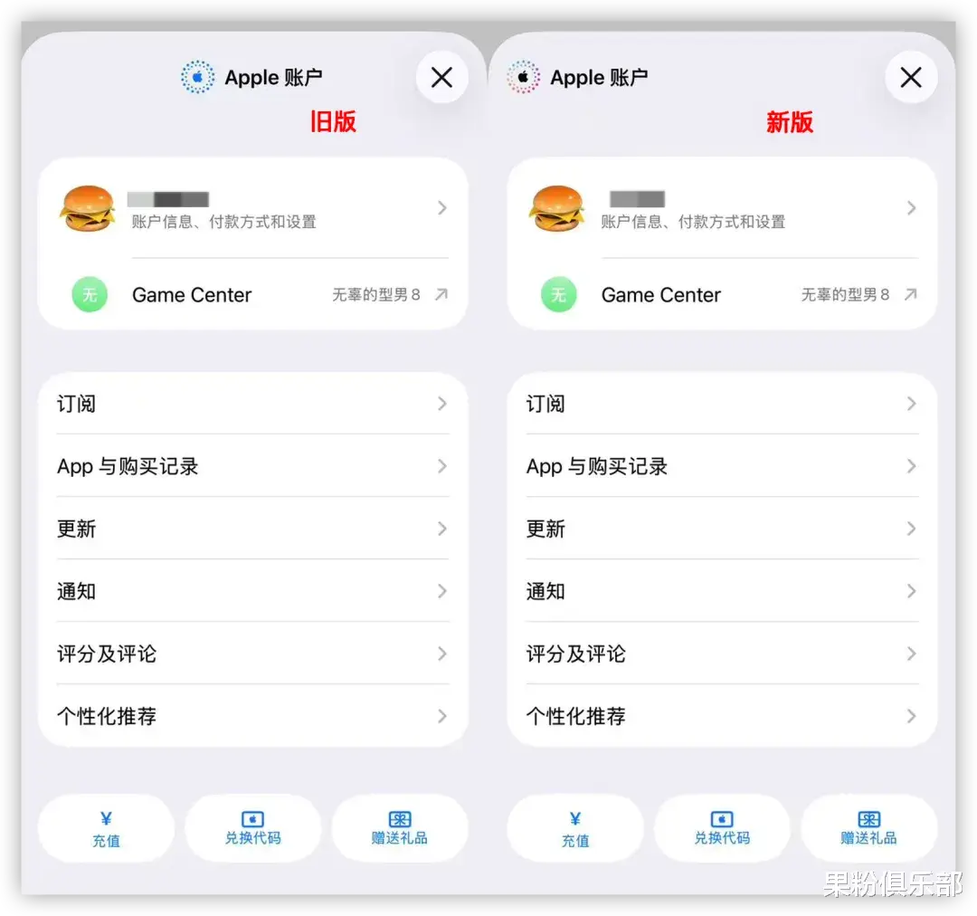 顶部的 Apple 账户图标设计更改,且挪至与下方账户信息平齐的位置。