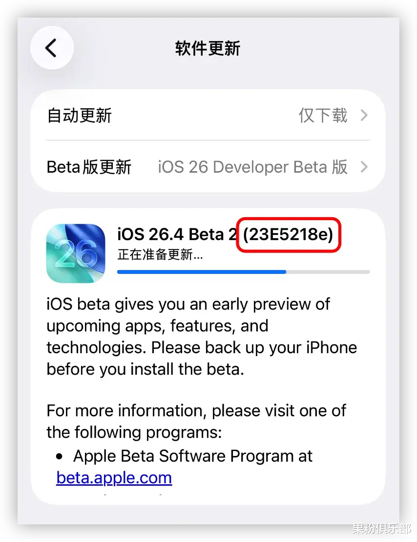 iOS 26.4 Beta 2 的系统版本号为 23E5218e,距离上次更新一周之隔。