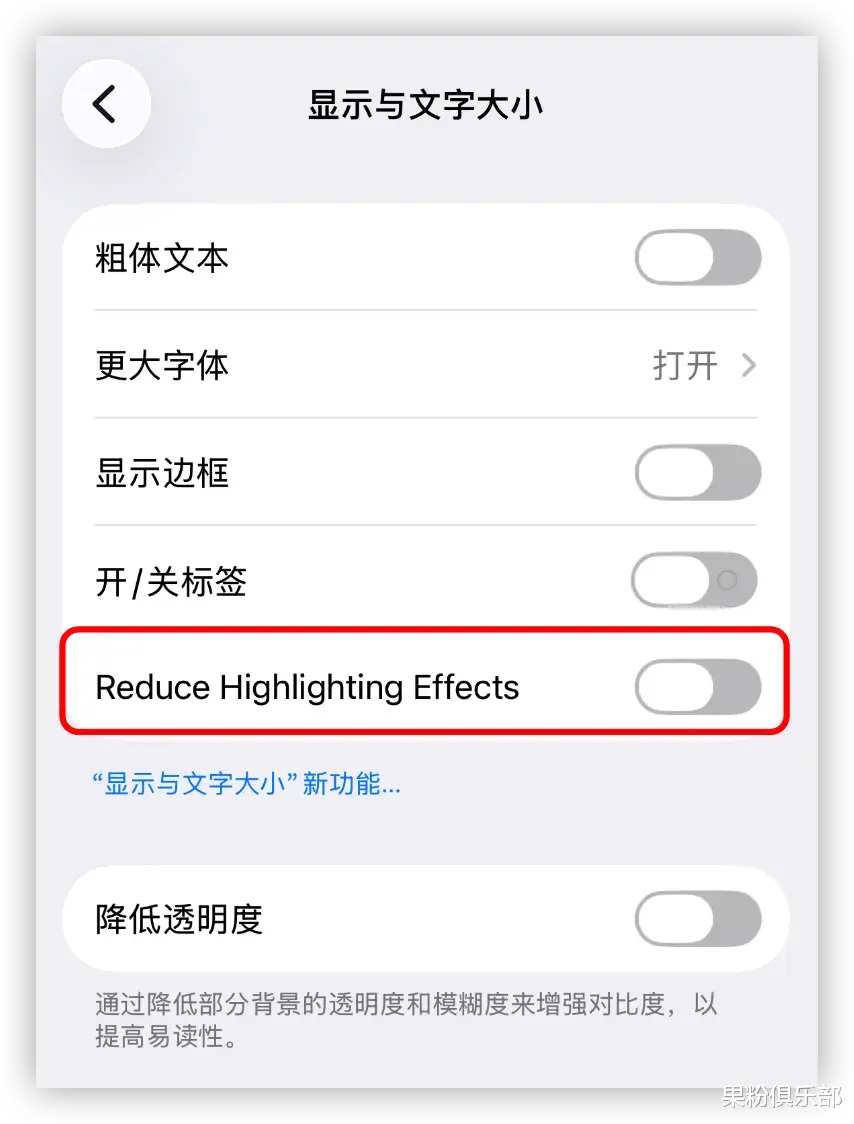 辅助功能这块,「显示与文字大小」中,新增了一个名为「Reduce Highlighting Effects」的功能。